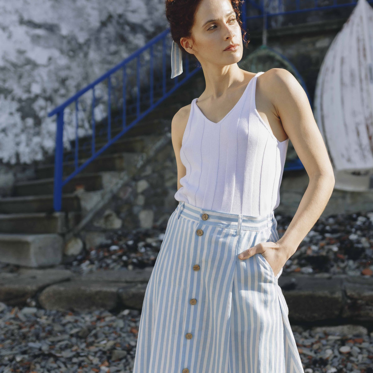 Falda midi de lino europeo con botones de madera de olivo y prácticos bolsillos. Banda elástica en cintura para un ajuste cómodo. Su diseño versátil va con todo tipo de figuras y ocasiones, ideal con tops o camisetas. Luce un estampado de rayas marineras azules. También disponible en rojo.
