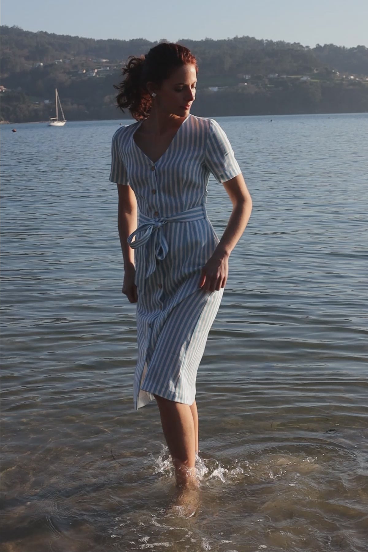 Vestido midi con manga corta y botones de madera de olivo. Confeccionado en lino europeo, tejido fresco y ligero que asegura comodidad. Presenta una cinta ajustable en la cintura, prácticos bolsillos y luce un favorecedor estampado de rayas marineras. Ideal para cualquier ocasión. También en color rojo.